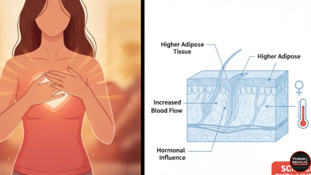 মেয়েদের শরীর পুরুষদের তুলনায় বেশি গরম থাকার পেছনে রয়েছে জটিল শারীরবৃত্তীয় ও হরমোনজনিত কারণ। বৈজ্ঞানিক গবেষণা অনুযায়ী, ইউনিভার্সিটি অব উটাহর একটি গবেষণায় দেখা গেছে যে নারীদের কোর বডি টেম্পারেচার পুরুষদের থেকে গড়ে ০.৪ ডিগ্রি ফারেনহাইট (০.২ ডিগ্রি সেলসিয়াস) বেশি। তবে বিরোধাভাসে, নারীদের হাতের তাপমাত্রা উল্লেখযোগ্যভাবে কম থাকে – গড়ে ৮২.৭ ডিগ্রি ফারেনহাইট, যেখানে পুরুষদের হাতের তাপমাত্রা ৯০ ডিগ্রি ফারেনহাইট।